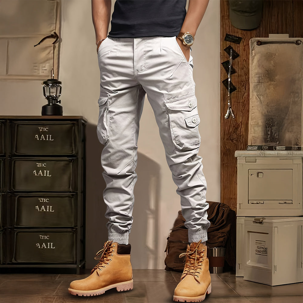 Tailored cargo joggers designed to bring a modern twist to rugged functionality. Crafted with a sleek silhouette and featuring multiple buttoned pockets, they balance utility with refined style. The elasticized cuffs offer a secure fit, perfectly complementing boots or sneakers for a versatile look.
